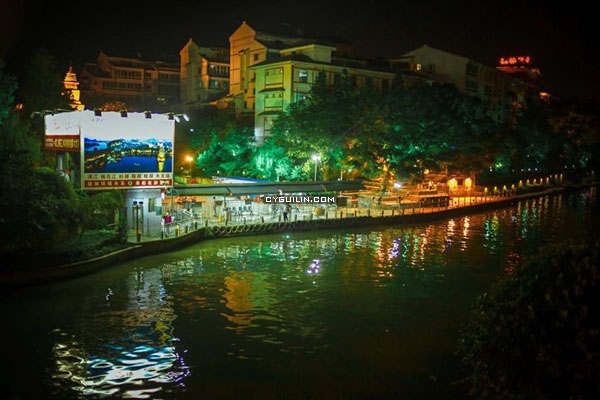 吃完晚饭,你们一定认为这个时候应该去逛逛夜景吧。是的,桂林的夜景很美,只不过是需要坐船看,我可是早就事前上网做好了功课,那就是桂林非常热门的夜游两江四湖,热门到啥程度,一路上都有小贩问我要不要去坐船游两江四湖,但是黄牛不可信,我早在网上预订好了晚上19:40从解放桥六匹马码头上船的游船,票是从景区官方网站订的,170元的豪华船,取票非常方便,直接在码头报手机号就拿到了,在码头拍了照,给亲们先睹为快:上船了,船上有个讲解的小妹妹给我们带来了生动的解说,漓江上的独秀峰、伏波山、叠彩山、远处的老人山还真是鬼斧神工,不愧是山水甲天下,20分钟后,开到了一个叫升船机的地方,这个地方很酷,因为船直接坐着电梯就上去了,你们觉得我疯了吧,告诉你们把,因为两江四湖中的四个内湖水位比漓江高3.5米左右,所以要靠他的水箱把我们跟坐电梯一样吊起来,然后才能继续游览,嘿嘿,牛逼吧,头一次看见。