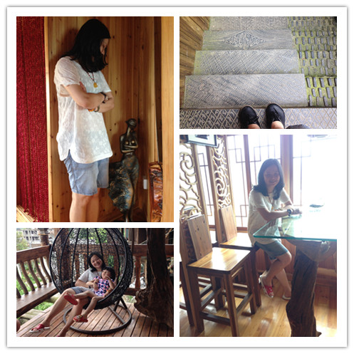 在一家名为绿园的咖啡店,小朋友如愿吃到了冰淇淋,而我,要了一个香蕉巧克力饼。这里的鬼子太多,以至于,山里人都在适应他们的饮食,店里就我们两个中国人,其它都是老外,看过去对面的平安客栈,每层都有老外在坐着或是靠着看外面风景。