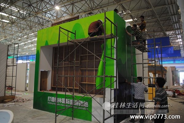 会展中心门前是一个巨大的旅博会宣传造型,整体框架刚刚搭好,上面标注着“桂林连着世界,旅博会在您身边”的字样。组委会工作人员介绍,28日,造型上还要摆放鲜花,届时这个造型将更加好看。