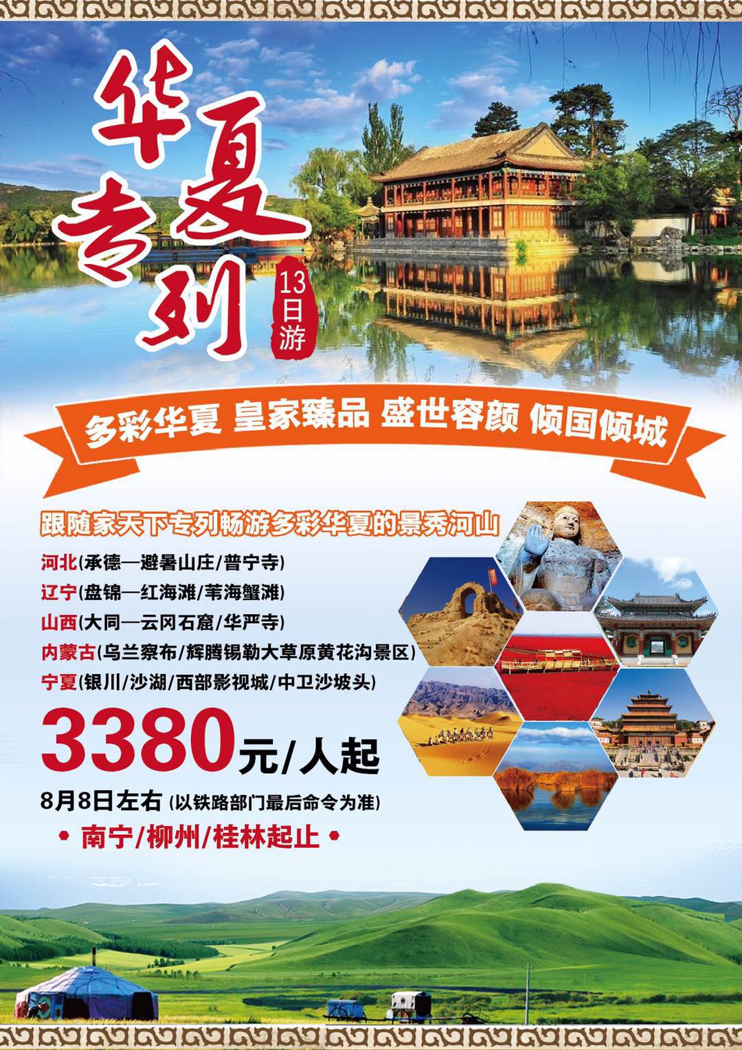 河北(承德—避暑山庄/普宁寺)、辽宁(盘锦—红海滩/苇海蟹滩)、山西(大同—云冈石窟/华严寺)、内蒙古(乌兰察布—集宁战役红色纪念园/辉腾锡勒大草原黄花沟景区)、宁夏(银川/沙湖/西部影视城/中卫沙坡头) 华夏文化专列13日环游